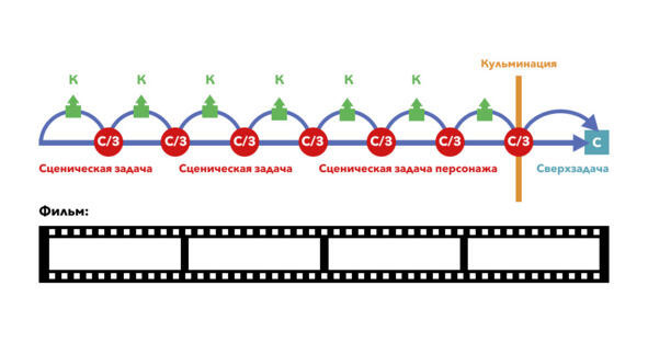 Сценическая задача не является сверхзадачей и ставится для конкретного эпизода в целом произведении. Например, героиня на протяжении всего фильма стремится выйти замуж это её сверхзадача. Но ведь это её стремление состоит из множества эпизодов: привести себя в порядок; ходить на свидания, чтобы найти партнёра; сделать так, чтобы он полюбил и в конце концов сделал ей предложение. И к каждому эпизоду вы находите сценическую задачу. Или вам предстоит найти работу. Для этого вы составите грамотное резюме; подберёте определённый стиль одежды, продиктованный профессией; остановите свой выбор на фотографии в деловом стиле; попросите отзыв с предыдущего места работы и т. д.