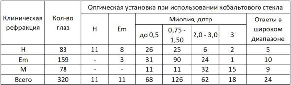 Волков В. В., Шамшинова А. М. «Функциональные методы исследования в офтальмологии» [Таблица 42. Кобальтометрическая оценка оптической установки в глазах с различной клинической рефракцией]