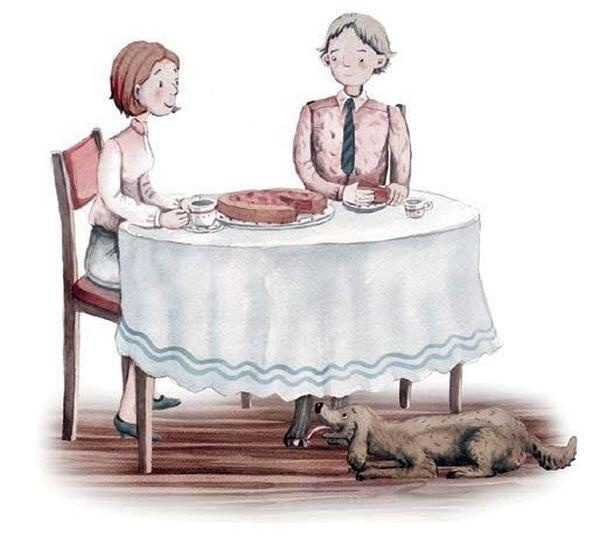 Дома у Бабушки жил большеухий лохматый пёс. Дедушка сразу его погладил чтобы показать, как он любит животных. Потом они ели вишнёвый пирог. Псу тоже достался кусочек, и он, чавкая, жевал его под столом.