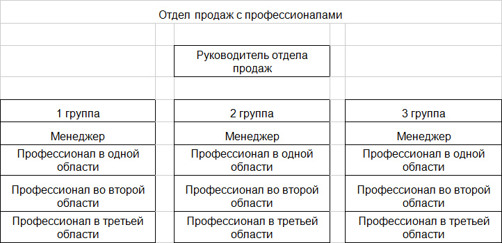 Бывают очень сложные продажи, когда в процессе участвует сразу несколько профильных специалистов. Примером может служить IT-сектор, строительство, исполнение обязательств на заказ под индивидуальные параметры заказчика. Здесь в процесс продажи внедряются специалисты узкого профиля, которые также взаимодействуют с заказчиком. Таких специалистов также нужно тщательно отбирать и обучать процессу продаж. К тому же процесс может затягиваться, пока составляется смета или проект. Вы должны учитывать это при планировании структуры и самого процесса продажи, но такие сотрудники должны быть внедрены в отдел продаж. Причем их должно быть достаточное количество.