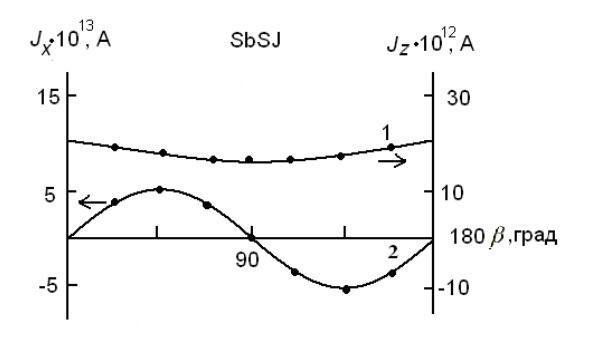 Рис.1. Зависимость фотовольтаического тока Jz (1) при l = 600 нм и Jx (2) при l = 460 от ориентации плоскости поляризации света в SbSI.