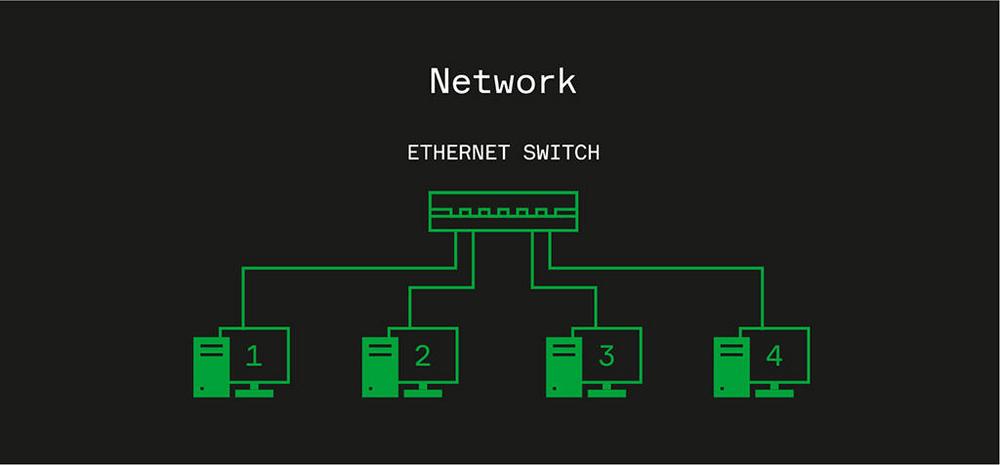 С сетевыми картами определились, теперь как подключить в сеть сразу три и более компьютеров? Если бы была необходимость подключить в сеть только два устройства, то нам бы понадобился один сетевой кабель, который бы просто подключили между двумя сетевыми картами. Но давайте подключим четыре компьютера, которые должны стать участниками одной сети. Чтобы соединить их, необходим коммутатор. Существуют разные модели таких устройств, которые отличаются скоростью портов, их количеством и другими особенностями, но я бы хотел выделить три основные типа таких коммутаторов и определить их различия.