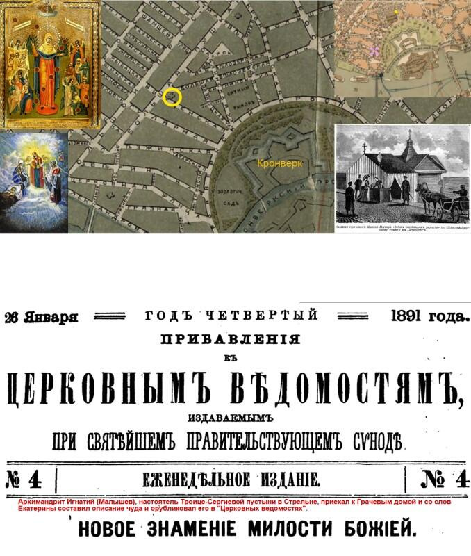 В ноябре 1890 г. у Николая отнялись руки и ноги, припадки участились до 6-8 раз в сутки, и настоятель местной Введенской церкви стал готовить его к смерти. В ночь перед днем своего рождения 3/16 декабря 1890 года, когда его кончины ожидали со дня на день, у Коли случился сильный приступ, после которого ему явилась Пресвятая Богородица со святителем Николаем. Матерь Божия велела Коле: «Поезжай в часовню, где упали монеты, шестого числа ты исцелишься, но ранее никому не говори». Изображение этой иконы вы видите выше по тексту. А находилась икона в Скорбященской часовне на Шлиссельбургском тракте за Александро Невской лаврой недалеко Стеклянного завода, ныне район проспекта Обуховской обороны. Сама икона Божией Матери «Всех скорбящих Радость» имеет сою необычную историю. 28 июля по старому стилю 1888 года в часовню попала молния во время грозы. Всё сгорело дотла. Пострадала и икона, остался целым только лик Богородицы, и к самой иконе пристало несколько медных монет, разбросанных молнией с ящика киота. Часовня после пожара была восстановлена, а икону стали считать чудотворною.
