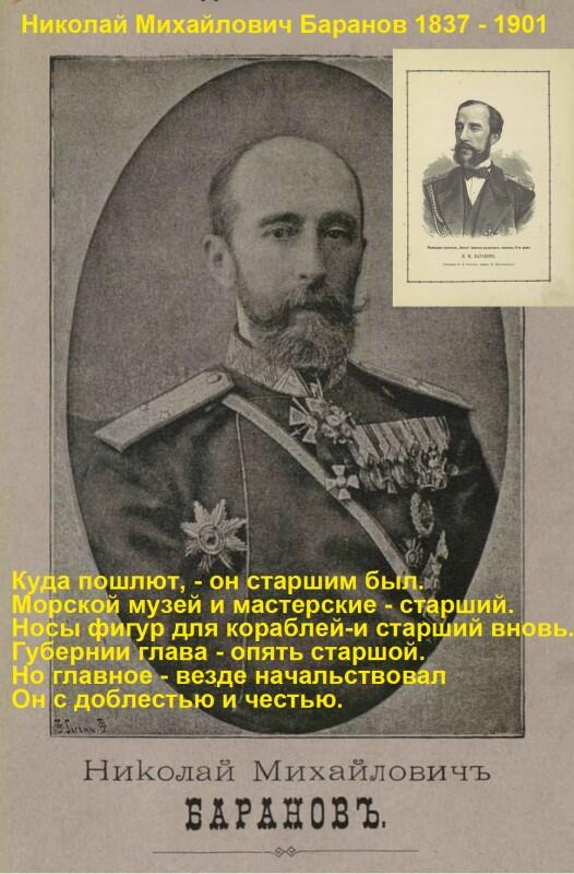 Морской музей в Петербурге изначально назывался Модель-камерой был организован Великим Петров и размещался на территории Адмиралтейства. В Модель-камере размещали половинчатую по размеру модель видных кораблей. Но во времена императора Николая I интерес к изготовлению копий утих. В 1867 году, после Крымской войны, началось второе рождение Морского музея. Место ему определено было тоже новое третий этаж того же Адмиралтейства более вместительное, чем ранее на втором этаже. Именно Н.М. Баранов в течение десяти лет управлял делами музея. Он, будучи лейтенантом морской службы, вёл работу по сбору коллекций и материалов с огромной энергией, много работал в архивах, разыскал в забытых складах многие уникальные экспонаты, убедил сотни морских офицеров и адмиралов передать в музей семейные реликвии, а также подготовил и издал первый каталог музея. Умудрился даже, изучая конструкции зарубежных винтовок, хранящихся на складах музея, изобрести винтовку. Она была принята на вооружение флота до русско-турецкой войны 1877-1878 годов. Именно во время этой войны он оставляет работу в музее и получает в своё командование пароход коммерческого флота «Веста», вооружённого необходимыми средствами для ведения боевых действий, в первую очередь на морских коммуникациях противника. В историю этой войны вписан бой «Весты» с турецким броненосцем, поразивший всю Европу своим неожиданным исходом сражения. Снаряд из одиннадцати дюймового орудия, которыми были снабжены все турецкие броненосцы (надо отметить, что в акватории Чёрного моря у Российского государства вообще не было своих броненосцев в то время) мог насквозь пробить пароход «Веста». Экипаж насчитывал 150 человек. Оба судна неслись навстречу друг другу. В одну сторону летели снаряды в 128 пудов, им навстречу 12 пудов. Англичане на турецком броненосце, осуществляли общее командование, даже не скрывая по форме одежды свою принадлежность к английскому флоту. Корабли сблизились на расстояние ружейного выстрела. Сам Баранов, находясь на командирской рубке и славившийся сам прекрасным стрелком, поднял ружьё убитого рядом матроса и стрелял в сторону турецко-английского врага. Для истины надо отметить, что «Веста» пролетела мимо броненосца и теперь была преследуема им. Снаряды противника сметают одну часть парохода за другой. Убитых командиров замещают их заместители, поверженных заместителей обычные моряки. И вот, долгожданный выстрел, разнёсший в щепы башенную броненосца. У неприятеля началась жуткая суматоха. Выстрелов со стороны противника больше не последовало. По палубе броненосца повалил густой пар, явно русское ядро разорвалось в машинном отделении. С палубы, порубленной вражескими снарядами, загремело многократное «Ура». А в след ещё вестовские снаряды, и ещё, и ещё. Броненосец стал заметно отставать. На рейде Баранов заметил дым приближающихся кораблей. После пятичасового боя капитан принял решение возвратиться в Севастополь. Капитан-лейтенант Н.М.Баранов получил сразу три награды военный орден Георгия 4-ой степени, назначен флигель-адъютантом и произведён в очередное воинское звание. И это вчерашний начальник Морского музея.