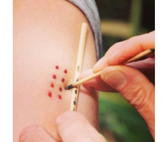 После того, как вода была с трудом выпита, не левом предплечье мне сделали лёгкий ожог, тонкой палочкой, поставили пять точек, сняли обожжённую кожицу и положили маленькую горошину яда на ранку.