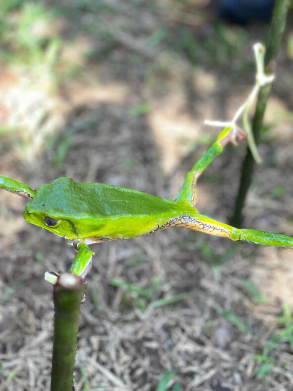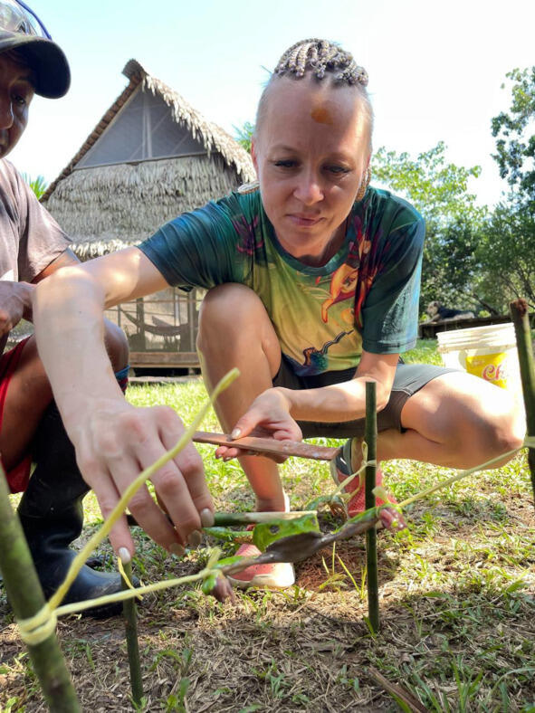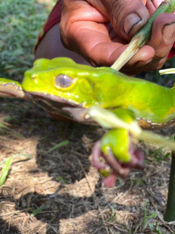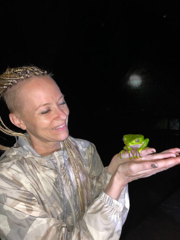 На рассвете, когда еще было темно, мы отправились в джунгли на поиск своих лягушек, я вглядывалась в ветви лиан и подсвечивая фонариком пыталась рассмотреть лягушку. Эти лягушки живут на деревьях их еще называют лягушки дерева обезьян.