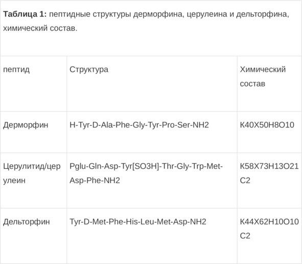 Ясно, что многие биоактивные пептиды Камбо являются весьма многообещающими источниками для современной медицины. Интересными болеутоляющими молекулами в Камбо являются агонист опиоидных рецепторов дельторфин, дерморфин и церулеин. Ни одна из этих молекул не сравнима по структуре с опиоидами, так как все они являются пептидами (табл. 1).