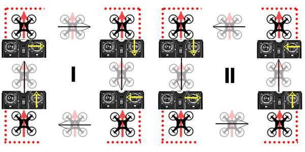 Теперь можно повернуть дрон вокруг вертикальной оси, в таком случае управлять становится труднее, так как нужно обязательно давать команды управления относительно положения нашего летательного аппарата. Попробуйте освоить квадрат в других положениях квадрокоптера. Например передней частью к вам.