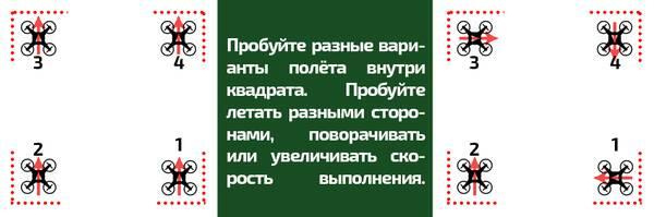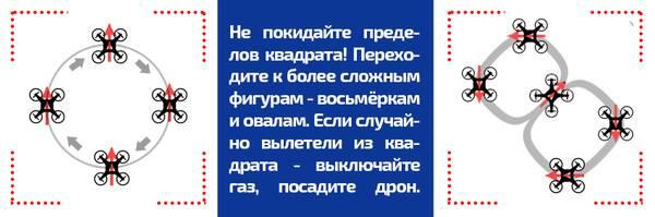 И вот вы уже отлично двигаетесь по периметру квадрата в любом направлении! Теперь можете или ещё увеличивать высоту, или пытаться летать определённые геометрические фигуры внутри квадрата, например восьмёрки и круги. Да и квадрат вам уже будет не нужен =)