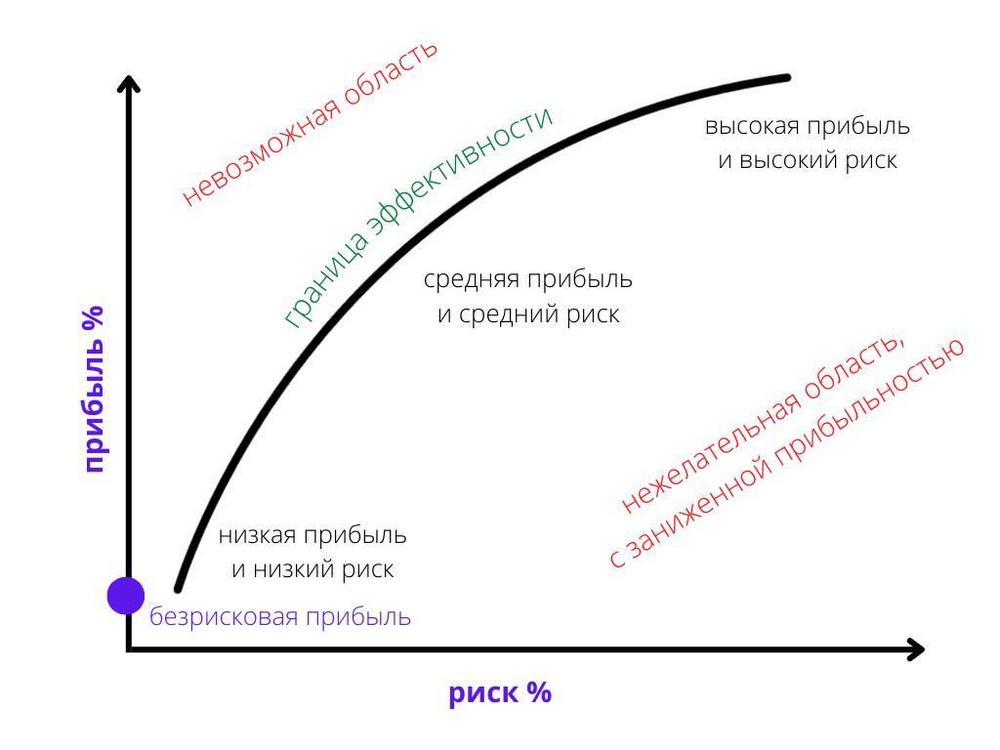 Инвестиции должны находиться на «границе эффективности», то есть на стыке области с заниженной доходностью и невозможной области с заниженным риском.