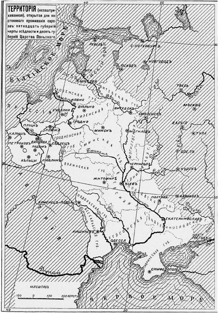 Рис. 3. Черта оседлости. Карта из книги Ю. И. Гессена «История евреев в России» (СПб.: Тип. Л. Я. Гинзбурга, 1914)