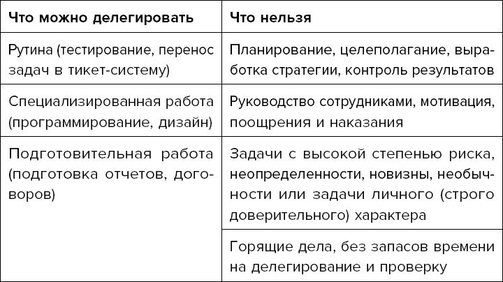 Я завел себе регулярную привычку раз в полгода просматриваю список дел, которыми занимаюсь. Смотрю, сколько времени они у меня отнимают. Оцениваю, насколько они мне нравятся и насколько они стали рутинными. Смотрю, должен ли я их делать сам. Можно ли делегировать что-то из рутины, неприятных мне дел или тех задач, где лучше справится специалист. Планирую: когда, кому и что я могу делегировать и в каком виде.
