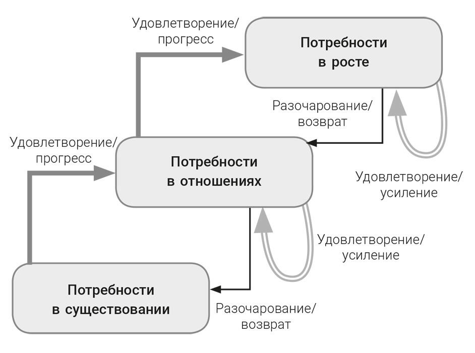 К существованию относятся потребности в безопасности и физическом комфорте. К отношениям стремление к социализации, необходимость в признании и уважении. К росту потребности в самосовершенствовании и самореализации. Основное отличие теории ERG от пирамиды Маслоу состоит в движении между потребностями. Оно может осуществляться в любом направлении, то есть для возникновения мотивации к верхним уровням потребностей не обязательно полностью удовлетворять низшие уровни.
