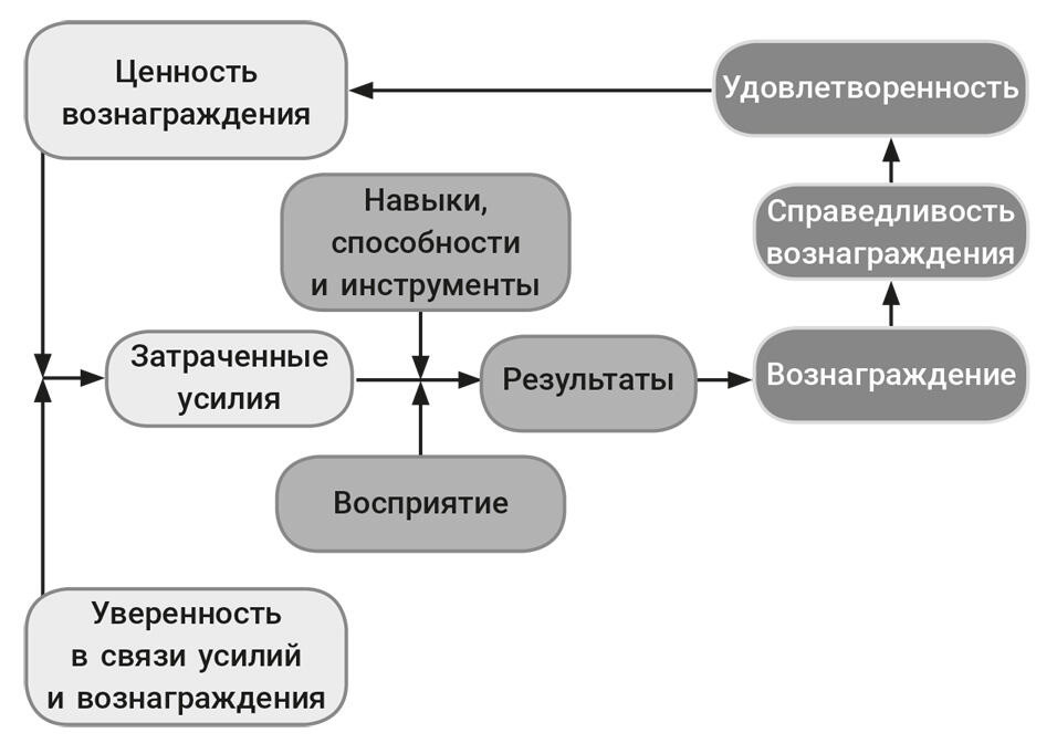 Модель состоит из пяти ключевых элементов: усилия, восприятие, результаты, вознаграждение и удовлетворенность. Прилагаемые усилия зависят от ценности и вероятности получения вознаграждения. Восприятие это субъективная оценка качества работы, за которую можно получить вознаграждение, а также его значимость. Результат совокупность качества, скорости и полноты выполненных действий. Вознаграждение может быть как внешним (материальные блага, признание, одобрение и поощрения), так и внутренним (самоудовлетворенность, обретение уверенности в собственных силах). Удовлетворенность это оценка результатов работы и совокупность внутренних и внешних вознаграждений при условии их справедливости.