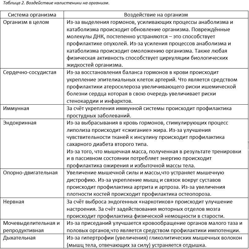 Калистеника это тренировки развивающие функциональную силу с помощью упражнений в которых в качестве противовеса используется вес тела тренирующегося. В таблице 2 даны сведенья о воздействии анаэробных (силовых) нагрузок, например, калистеники на организм.