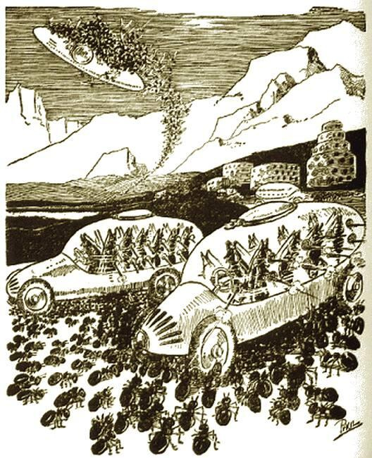 Тогда ракообразные существа сделали открытие. Они нашли огромное количество мертвых муравьев там, где армия захватчиков перебралась через огромную кучу отходов с серных заводов, и, испытав это на пленных муравьях, они обнаружили, что это была мгновенная смерть для существ. Это позволило им истребить своих кровных врагов, так как материал был изготовлен в огромных количествах и помещен в большую стену или кучу вокруг наступающего войска жителей. Окруженные таким образом, муравьи были бессильны причинить им вред, и постепенно все муравьи, кроме нескольких, были полностью уничтожены. Эти немногие выжившие были взяты в плен и заключены в тюрьму, и именно их потомки находятся сегодня в яме.
