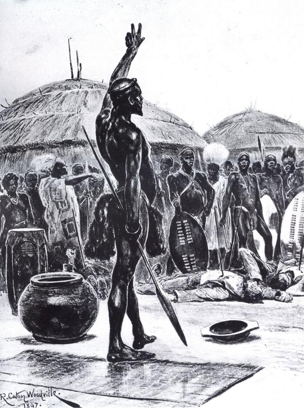 В честь гостей снова были устроены военные танцы. Воины тянули длинную песню, сам Дингаан тоже подпевал. Буры не замечали, что круг танцующих вокруг них постепенно сжимался. Во время последнего куплета песни Дингаан вдруг вскочил со своего стула с криком: «Балалани абатагати! (Убейте колдунов!)»