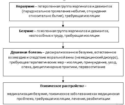Системообразующей связкой понятий, определяющих всю историческую периодизацию психиатрии, является континуум: «Разум Неразумие Безумие Душевная болезнь Психическое расстройство».