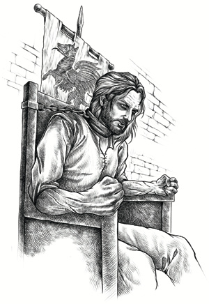 Подсудимого усадили в кресло. Веревки сняли, почему-то оставив руки свободными, зато шею и голени приковали к железным ножкам и спинке. Один из конвоиров, насмешливо ухмыляясь, водрузил рядом грязное знамя Митровиц с крылатым псом в латах на желтом поле.