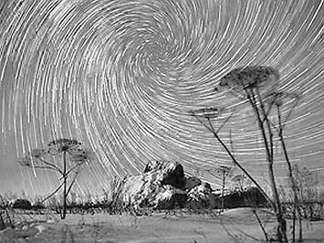 Увидеть полюс мира несложно. Для этого нужно закрепить неподвижно камеру на штативе и поставить длительную выдержку. Снимок с пятнадцатиминутной экспозицией позволит увидеть, что звездные пути представляют собой дуги окружностей, которые тем больше, чем дальше звезда находится от небесного полюса (рис. 3).