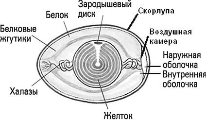 Рис. 12. Птичье яйцо. Желток подвешен в белке на халазах. Птенец развивается из зародышевого диска на желтке