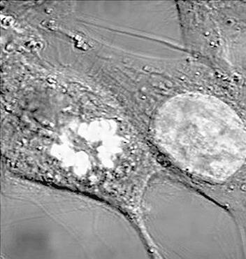 Рис. 10. Клетки HeLa (см. рис. 2 на цветной вклейке). Клетка справа находится в интерфазе у нее окрашено все ядро. Левая клетка претерпевает митоз, поэтому ДНК конденсирована и окрашено не все ядро