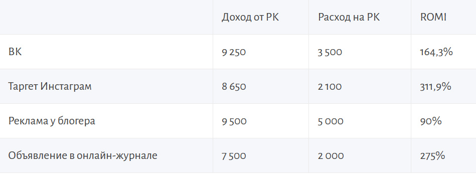 К примеру, берется период отчетный месяц. За последние 30 дней клиника продвигалась через ВК, таргет Инстаграма, брала рекламу у местного бьюти-блогера и давала объявление в информационный онлайн-журнал (целевая аудитория: от 18 до 40 лет, высшее оконченное и незавершенное образование, средний и выше среднего доход). Маркетер собирает воедино необходимые цифры и рассчитывает ROMI.