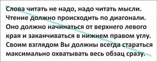 Этот просмотр очень похож на беглый, только отличается от него тем что работаем мы уже непосредственно с самим текстом. То есть просматриваем его не по отдельным частям а уже целиком применяя разные виды чтения. Например чтение по диагонали. Для того чтобы начать читать текст таким образом мы должны двигать своими глазами по строчками в виде буквы Z. Чтение с помощью такой техники уже и есть чтение по диагонали. Просто со временем глаза привыкнут и начнут двигаться только по диагонали, как на картинке ниже.