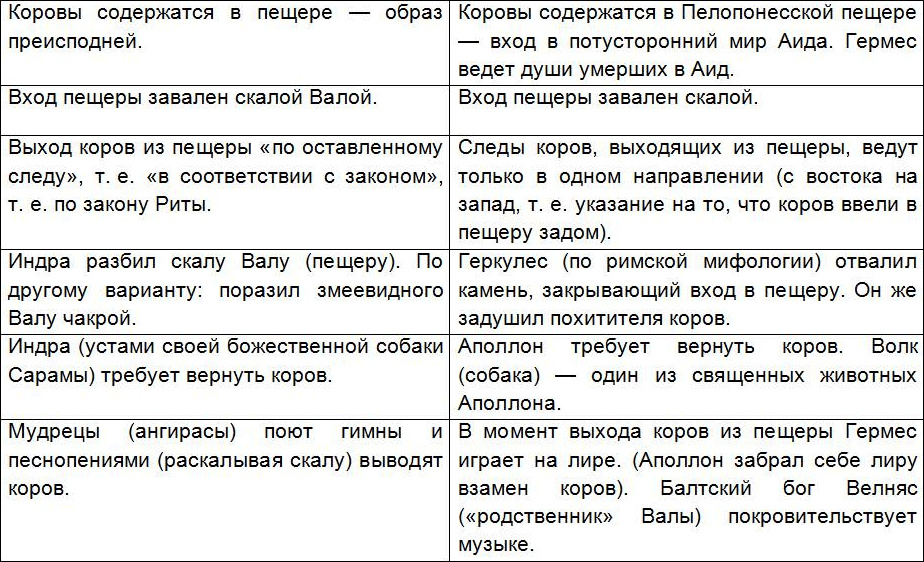 Сравнительная таблица показывает общий для индоевропейских народов сюжет. Миф об Аполлоне близок по сюжету ведийскому мифу о боге Индре и его коровах. Сюжеты обоих мифов, в принципе, аналогичны и должны быть связаны, скорей всего, с культурой андроновских племен. Идет ли здесь речь о заимствовании греками индийского мифа или наоборот, определить сложно. Трудность заключается в выявлении первоисточника мифа.
