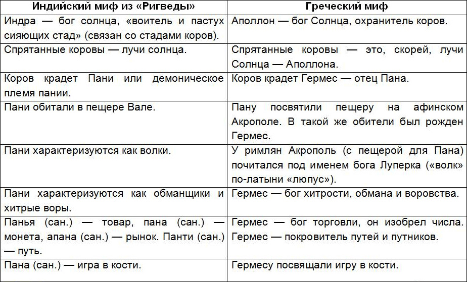 Составим сравнительную таблицу между индийским и греческим мифами, которая поможет понять не только общие сюжеты для индоевропейских народов, но и возможные истоки их происхождения.