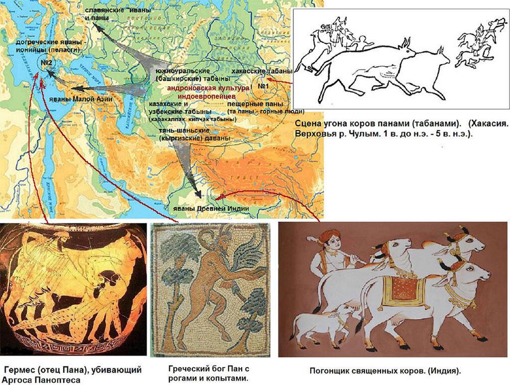 Ниже показана карта возможных путей проникновения «андроновского» мифа о похищении коров как в далекую Индию, так и в Древнюю Грецию. Индоевропейские мифы (индийский и древнегреческий) имеют не только единый сюжет, но и общий источник происхождения (на карте-схеме 2, отроги северных хребтов Саяно-Алтая обозначены кружком 1).