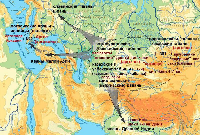 Кружком 1 показана археологическая область окуневской культуры (II тыс. до н. э.) народа пан (табан) на северных отрогах Саяно-Алтая. В фольклоре хакасов эта земля сохранилась как Мöнi чир или Кöг Мен (Небесный Мен). Под кружком 2 изображена горная область Мани, где располагался Пелопоннес ионийцев (яванов) пеласгов, прибывших в Грецию из Малой Азии. Кстати, на западном побережье полуострова Малая Азия (XII век до н. э.) находилась область Иония (Явания).