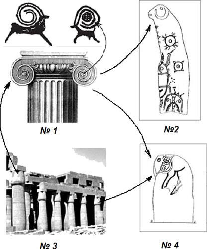 1. Ионическая (яванская) колонна символ «красного» фаллоса. Солнечные бараны архары. Калбак-Таш. Горный Алтай (слева, сверху).