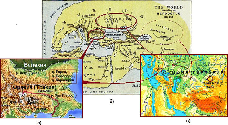 а) восточное царство пеласгов Фракия и Валахия; б) карта Геродота (V в. до н. э.) с указаниями Фракии (Тракии), Скифии и некоторых сакских областей; в) Тартария Внутрення часть Азиатского континента, фигурирующая на многих старых картах (кружком обозначены горы Ала или скифская Киммерия).