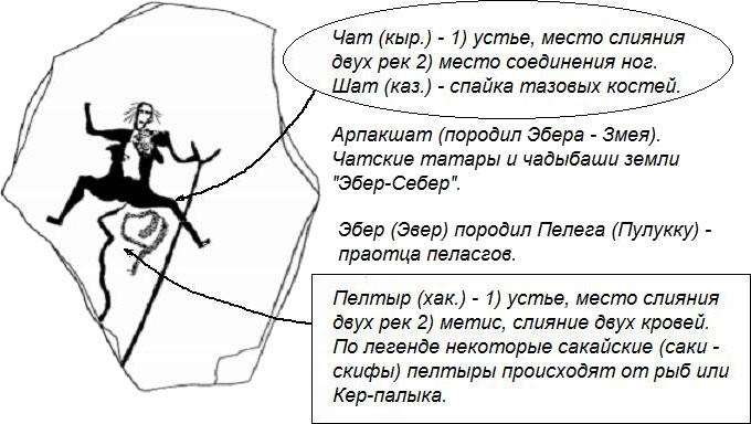 В изображении необычного рождения шата (тюркского царя или принца двух кровей), в виде змеи из лона матери (см. «шат» место соединения ног, т. е. детородный орган или устье реки) мы имеем иллюстрацию к сюжету о рождении Иджини-шата (кит. Ичинишиту). Роженица была обнаружена на плите могильника Лебяжье (Краснотуранский район), не далеко от устья рек Сыда (кет. «сет» река) и Енисея (Эне сай).