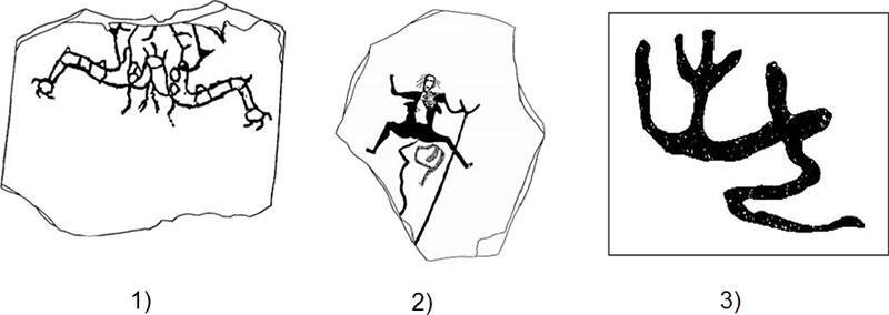 1) и 2) петроглифы окуневской культуры (правый берег Среднего Енисея, Хакасия);