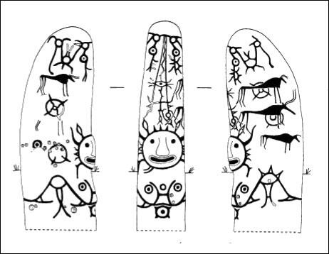 Вала (Ала) считалась скалой (горой) «сокровищницей, полной скота, коней и благ», что может быть сопоставлено также с культом «живых» скал, в которых по представлениям многих сибирских племен и содержатся богатства в виде скота. Культовые росписи, как домашних, так и диких животных (чаще парнокопытных), на древних камнях и скалах символизировали «захват» и удержание их душ, о чем мы вскользь упомянули выше. Ниже приведены изображения некоторых каменных изваяний окуневской культуры в Хакасии, имеющие прямое отношение к образу Валы.