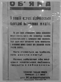 Вот одно из первых на восточном фронте объявление по-украински о «выселении» местных евреев. Оно грозит расстрелом остальному населению не только за укрывание жертв, но и за последующие грабежи их имущества (немцы как-никак!).