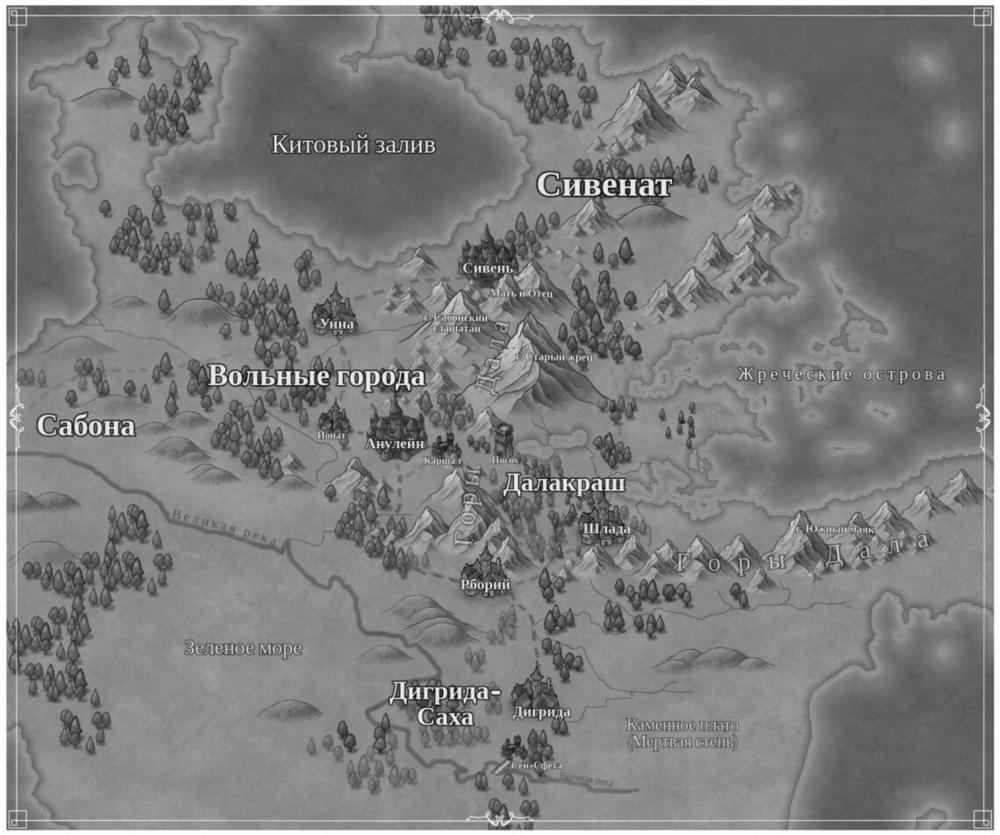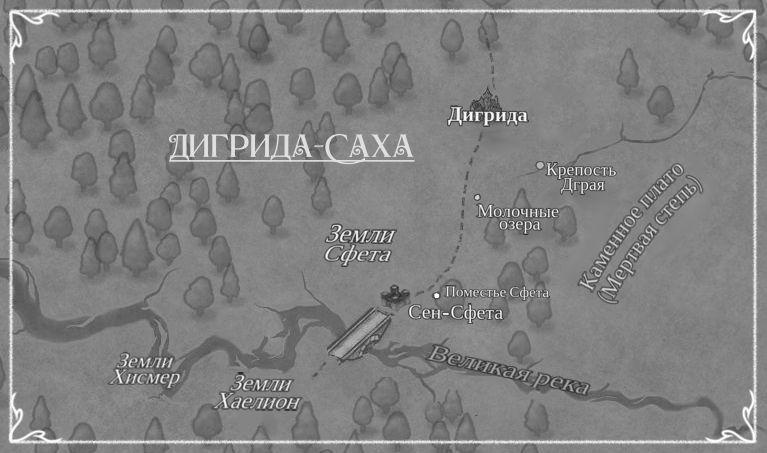 Эти охотничьи угодья в середине континента. Мало ископаемых, только одна серьёзная река она давно измельчала. Лето тёплое, а зима холодная, но не суровая. В общем, ничего особенного. Но Дигрида-Саха зажата между интересными местами. Снизу растянулся безлюдный жаркий юг. Земля там не плодородна и бедна, даже ручьёв почти нет. Люди не отважились селиться в подобном месте. Слева и справа от страны две пустыни-степи: Зелёное море и Каменное плато, так же известное как Мёртвая степь.