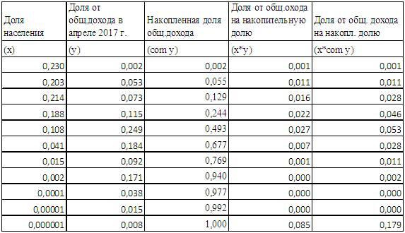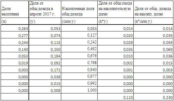А теперь всё сведём в таблицу для расчёта коэффициента Джини: