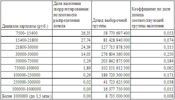 Теперь вспомним, что в апреле 2017 г. Росстат делал выборочный анализ распределения населения по доходам. Выборка была довольно представительная 27 015 073 человека 18,4% от общей численности населения. В этой выборке ощущалось предпочтение охвата тех, кто получал доход, близкий к среднему по стране. Это вызвало сомнение в репрезентативности, в связи с чем я в статье «Доля государства и Судьба человека», которая публиковалась ранее, приведённые данные Росстата поправил исходя из плотности распределения дохода по долям населения. При расчёте исходил из того, что МРОТ (на тот период 7500 руб.) встречается чаще, чем зарплата в 15 млн. рублей. Следовательно, чем больше МРОТ вписывается в диапазон, тем реже эта зарплата встречается. Отсюда получился поправочный коэффициент. Доход в группе посчитал, умножив число работников на средний заработок в данной группе. Например: (15400 + 7500)/2*численность работников в группе. В той статье меня интересовала средняя заработная плата. Сейчас интересует коэффициент, отражающий долю дохода в группе. Используя знакомые нам данные, определим коэффициент и сведём их в таблицу: