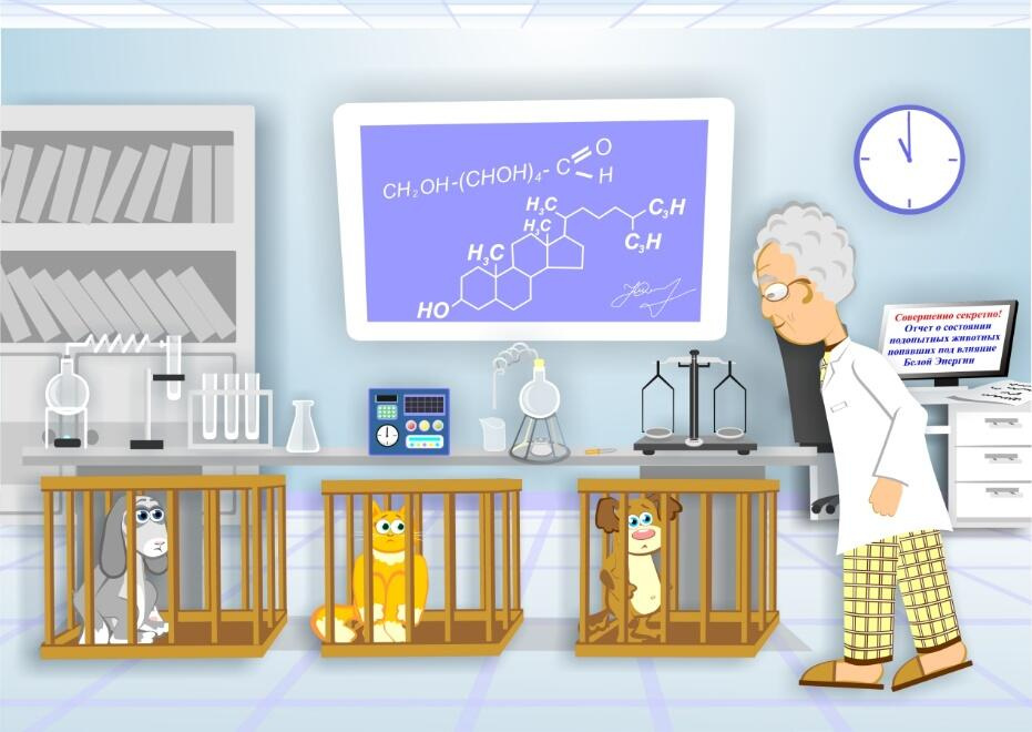 Профессор метался от одного аппарата к другому, то и дело, наклоняясь к перепуганным зверятам. Водил туда-сюда, какими-то штуками, светил в глаза ярким фонариком, всё время что-то бурчал себе под нос, записывал в тетрадь и печатал на компьютере. Бедные подопытные итак прибывали в шоковом состоянии, а тут ещё какие-то процедуры. После напряженной суеты и беготни, профессор, наконец-то угомонился. Он сел за стол и долго ещё печатал, пристально вглядываясь в экран монитора.