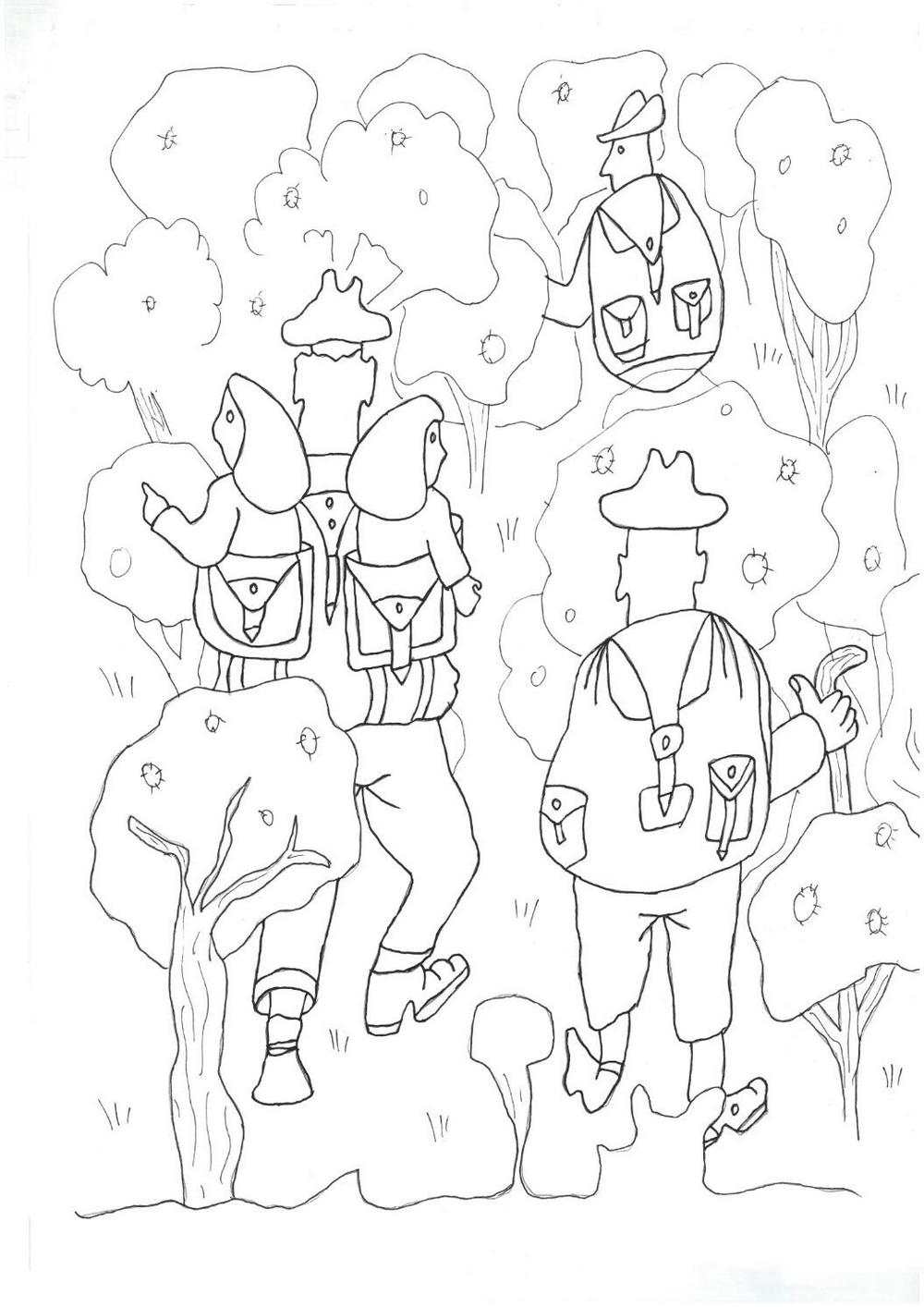 Евген, Артем и Сёма, все трое с мешком, топором и палкой в руке, отправились в путь. В мешке у Сёмы также была длинная веревка, которая нужна была ему для связывания деревьев. Во время марша лесорубы оглядывались в поисках медвежьих следов. Через некоторое время они нашли отпечатки его лап на земле и траве, потом увидели в кустах какие то листья и веточки, которые он сорвал на ходу, потом заметили, что он поцарапал кору дерева.