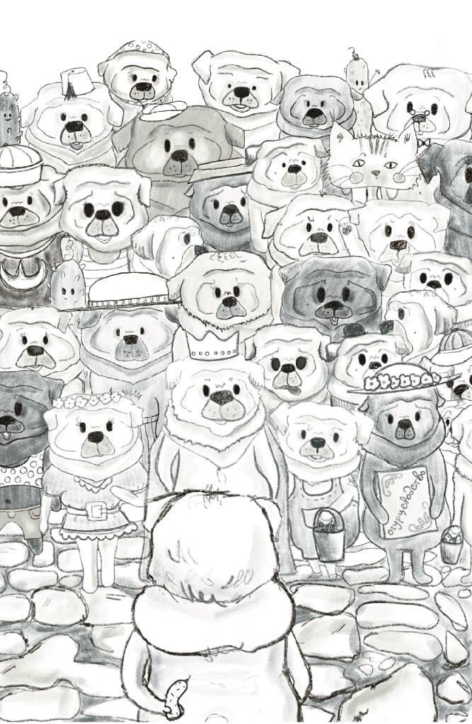 Один черный мопс снял зеленую клетчатую кепку и почесал голову. Девочки-мопсы в розовых платьях с белыми фартуками стояли, прикрыв рот лапкой, а мопсы-мальчики в джинсовых комбинезонах нахмурили брови.