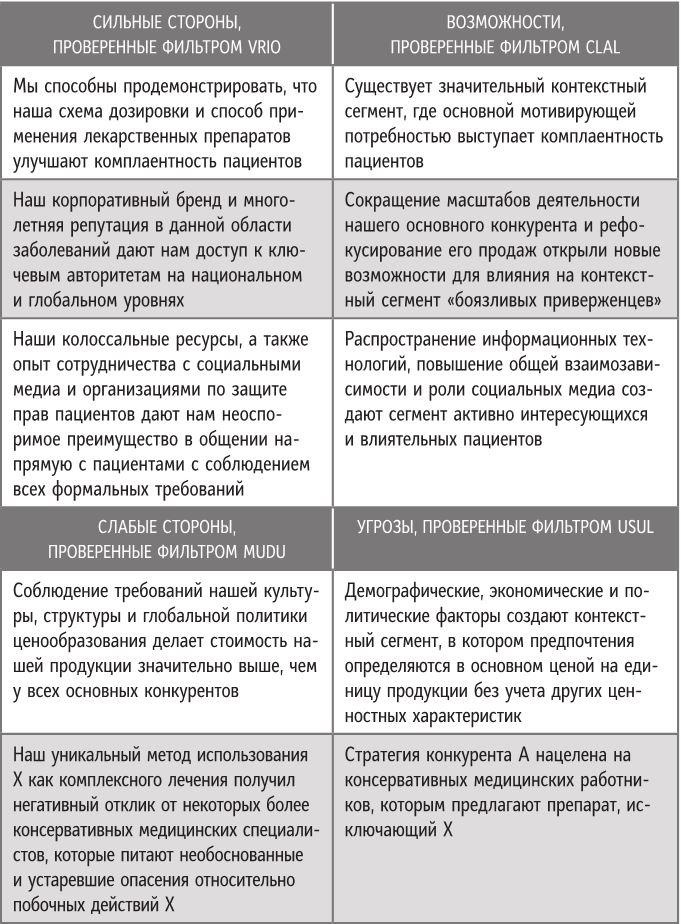 Менее распространенная ошибка упущение данных, которое происходит, когда предыдущий инструмент поиска данных был использован некорректно. К примеру, если сильная сторона, такая как «надежная конструкция и долговечность» медицинского оборудования, прошла проверку фильтра реальности VRIO, но нет соответствующей возможности, с которой ее можно сочетать, то, вероятно, инструмент контекстной сегментации был использован недостаточно точно, чтобы выявить сегмент, на котором пригодилась бы эта сильная сторона компании (к примеру, контекстный сегмент мобильной медицинской бригады по оказанию первичной помощи на новых, формирующихся рынках). То же самое относится к ситуации, когда вы упустили угрозу в результате ошибки на этапе анализа конкурентного давления или анализа эмерджентных свойств. Следует пересмотреть, как вы использовали другие инструменты, причем на этот раз нужно обратить внимание на упущенные факторы. К примеру, кто, на ваш взгляд, оценил бы сильную сторону, которая осталась без пары? Или почему вы решили, что угроза, оставшаяся без соответствия, важна? Обычно это приводит к выявлению недостающих данных, которые позволят завершить процесс SWOT-сопоставления.