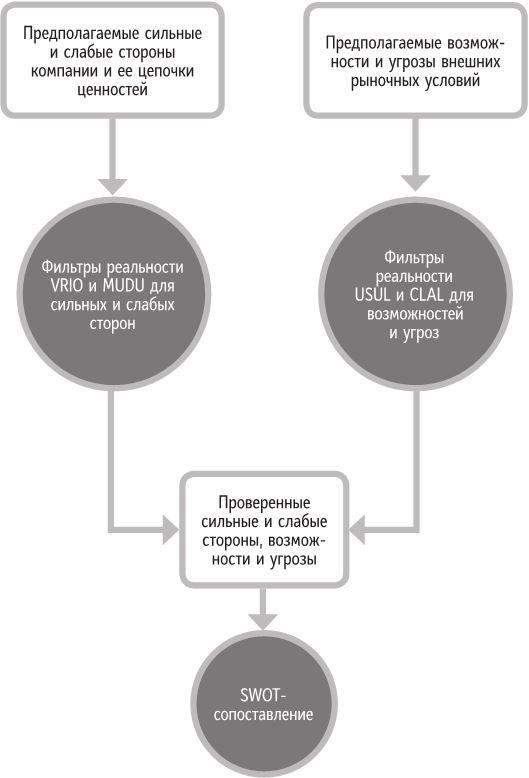 Фильтры реальности следует использовать непосредственно перед SWOT-сопоставлением, потому что пользоваться им без фильтров то же самое, что вводить некорректные данные в мощный компьютер; результаты будут некорректные и нанесут значительный вред, потому что будут казаться достоверными. Данные для фильтров реальности все, что мы считаем сильными и слабыми сторонами, возможностями и угрозами. Эти данные можно собрать, используя формальные методики, описанные в этой книге, такие как сравнение цепочки ценностей (см. главу 8), анализ конкурентного давления (см. главу 9), контекстная сегментация (см. главу 10), анализ эмерджентных свойств (см. главу 11), анализ жизненного цикла продуктовой категории (см. главу 12) и иногда петля гипотезы (см. главу 13). Помимо этого, данные можно дополнить вашими представлениями о сильных и слабых сторонах, возможностях и угрозах. Если использовать их правильно, фильтры реальности играют роль лакмусовой бумажки, отсеивая ошибочные представления и оставляя только проверенные факторы, которые затем можно отправить на SWOT-сопоставление, будучи уверенным в результате. Место фильтров реальности в процессе построения стратегии бренда показано на рис. 6.1.