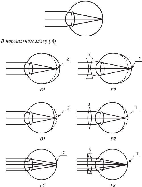 Б2, В2 двояковогнутая и двояковыпуклая линзы для исправления дефектов близорукости и дальнозоркости; Г2 цилиндрическая линза для коррекции астигматизма; 1 зона четкого видения; 2 зона размытого изображения; 3 корректирующие линзы