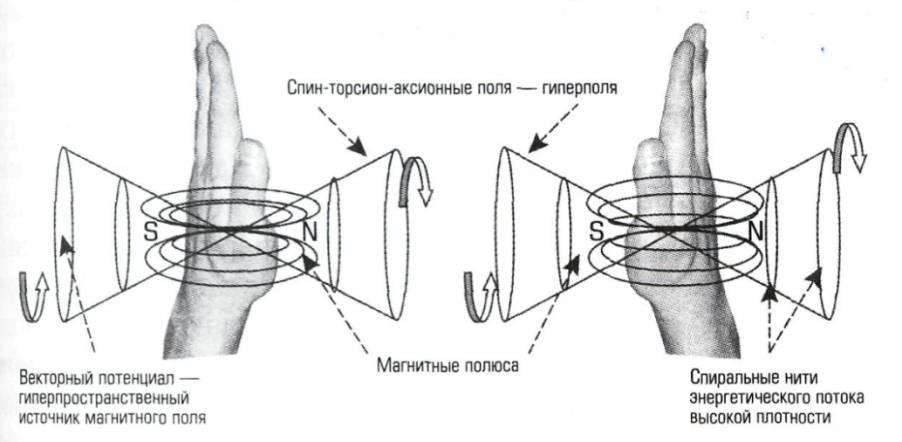 Энергия, создаваемая всем организмом человека, имеет электромагнитную природу, аналогичную полю Земли. И только мозг человека, вместе с черепной коробкой, излучает информационные, торсионные поля. Поле человека ориентируется по силовым линиям магнитного поля Земли. Когда ладони руки человека сложены вместе в позе «молитвы», обращения к Высшим Силам, тогда магнетизм человека заставляет энергию протекать по замкнутому контуру из правой ладони в левую, через головной мозг. Кисти рук посылают информацию тонким телам человека с помощью торсионных полей. Человеческие руки способны осуществлять генерирование спин торсион аксионных полей. Эти поля имеют форму вращающейся воронки, исходящей из области центра ладони. Рука, как источник генерирования торсионного поля, энергетически связана с Сердцем человека и его мозгом, а значит и с его Намерением, Силой Воли и способностью мозга производить генерирование торсионных полей. Человеческое тело является живым приемником и передатчиком, излучателем энергий всевозможных частот. Тороидальная форма информационного поля, является основной характеристикой полей, которые генерируются сердцем и ладонью человека. Такая форма поля является основным фактором, влияющим на характер спиралевидного вращающегося вихря, который захватывает или испускает различные энергии и свет.