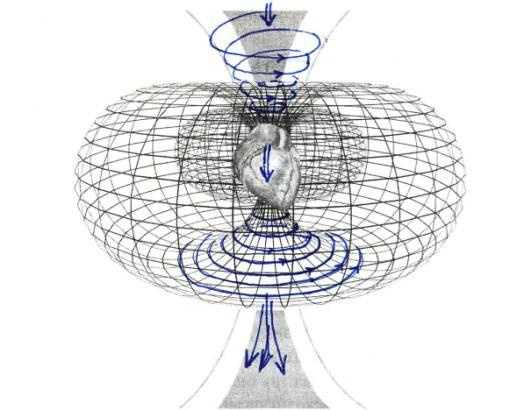 Энергия, создаваемая всем организмом человека, имеет электромагнитную природу, аналогичную полю Земли. И только мозг человека, вместе с черепной коробкой, излучает информационные, торсионные поля. Поле человека ориентируется по силовым линиям магнитного поля Земли. Когда ладони руки человека сложены вместе в позе «молитвы», обращения к Высшим Силам, тогда магнетизм человека заставляет энергию протекать по замкнутому контуру из правой ладони в левую, через головной мозг. Кисти рук посылают информацию тонким телам человека с помощью торсионных полей. Человеческие руки способны осуществлять генерирование спин торсион аксионных полей. Эти поля имеют форму вращающейся воронки, исходящей из области центра ладони. Рука, как источник генерирования торсионного поля, энергетически связана с Сердцем человека и его мозгом, а значит и с его Намерением, Силой Воли и способностью мозга производить генерирование торсионных полей. Человеческое тело является живым приемником и передатчиком, излучателем энергий всевозможных частот. Тороидальная форма информационного поля, является основной характеристикой полей, которые генерируются сердцем и ладонью человека. Такая форма поля является основным фактором, влияющим на характер спиралевидного вращающегося вихря, который захватывает или испускает различные энергии и свет.