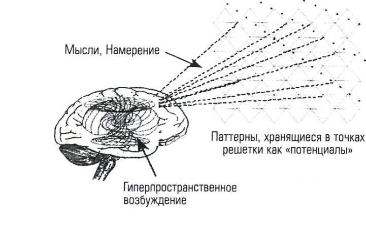 Китайские мастера техники тай-цзы могут производить генерирование мозгом информационных полей, имеющих очень большую величину и на всю длину вертикальной трубы завихрения внутри тора, в науке это известно как мост Эйнштейна-Розена. Порожденное мозгом мощное торсионное поле, а также Сила Воли, выраженная в определенном Намерении совершить задуманное, позволяет им входить в резонанс с Всемирной Космической Сетью, физическим вакуумом, и с помощью источника излучения, ладоней рук, производить исцеление больного. Эти мастера, если необходимо, могут даже сразить противника мощным выбросом импульса энергии. Мозг и черепную коробку можно представить, как кристаллическую резонирующую органическую структуру, антенну, излучатель, который управляется Низшим Разумом, Низшим Сознанием человека, которое, имеет взаимосвязь с Высшим Сознанием человека, его Душой, Духом. Величина поля генерирования мозга зависит от совместной работы всех отдельных частей мозга, его желез эндокринной системы кровообращения: таламуса, гиполамуса, гипокампа, миндалин, а также совместного функционирования гипофиза шишковидной железы и каротидной железы. В идеале, поле мозга должно стремиться быть вытянутом на всю длину цилиндрической трубы тора, моста Эйнштейна-Розена. Естественно, что максимальная активность мозга и способность генерирования поля идеальной конфигурации определяется степенью его духовного развития, общим здоровьем, как тела так и мозга, и постоянной тренировкой активности мозговой деятельности. Именно тренинг мозга приводит к увеличению завихрений, извилин мозга, к активизации его дремлющих нейронов, а значит и к общему увеличению активной части всего мозга. Информация Общего Банка данных Бога Отца, которая хранится в пространстве в виде свернутых голографических паттернов, микро информационных полей, в Хрониках Акаши, принимается мозгом, как приемником и передается в электрические сигналы мозга, где далее она расшифровывается и переводится Низшим Сознанием в виде образов. Вероятнее всего, что именно микро трубчатая структура мозговых клеток и вода, содержащаяся внутри микротрубок, может становиться высокоструктурированной и высокоорганизованной, способной запоминать, хранить полученную информацию. Этот процесс называется мыслительной деятельностью мозга. Процесс хранения и выдачи информации мозгом аналогичен жесткому диску памяти современного компьютера, выполненного на жестких кристаллах. Современные ученые создали уже сегодня жесткий диск памяти, основанный на биологической клетке. Это устройство копирует деятельность мозга человека. И это есть определенное, перспективное направление развития науки будущего. Процесс структурирования воды в микро трубках мозговых клеток может производиться самим человеком с помощью своего сильного Волевого Усилия и определенного Намерения. Также этот процесс может осуществляться с помощью внешнего источника: поля Целителя и созданного им торсионного паттерна, или же с помощью внешних технических устройств, торсионных генераторов правого или левого полей вращения. Источники внешнего поля, целитель или торсионный генератор, активизируют мозг пациента, оказывая благотворное воздействие, или наоборот снимают с него информацию, уменьшая общую энтропию человека, наводя вр